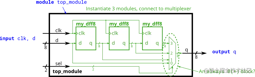 问题: 给出了一个名为my_dff8的模块,包含两个输入和一个输出(实现一个8bit的D触发器)。请实例化三个,并将它们连接在一起,形成一个长度为3的8bit移位寄存器。此外,再写出一个4选1多路复用器(未提供模块模型),根据输入的sel[1:0]选择要输出的内容:输入D的值,在第一个D触发器之后的值,第二个或第三个D触发器之后的值。(可以说sel选择的是输入延迟的的周期数,0~3个时钟周期不等。)