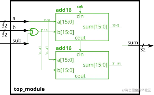 当sub为1时,使用32位的异或门对B进行取反。(这也可以被视为b[31:0]与sub复制32次相异或,请参阅复制运算符Problem 17: Replication operator(Vector4))。同时sub信号连接到加法器的进位。