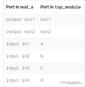 按端口名称,mod_a instance2 ( .out(wc), .in1(wa), .in2(wb) ); 直接对应端口名称进行例化