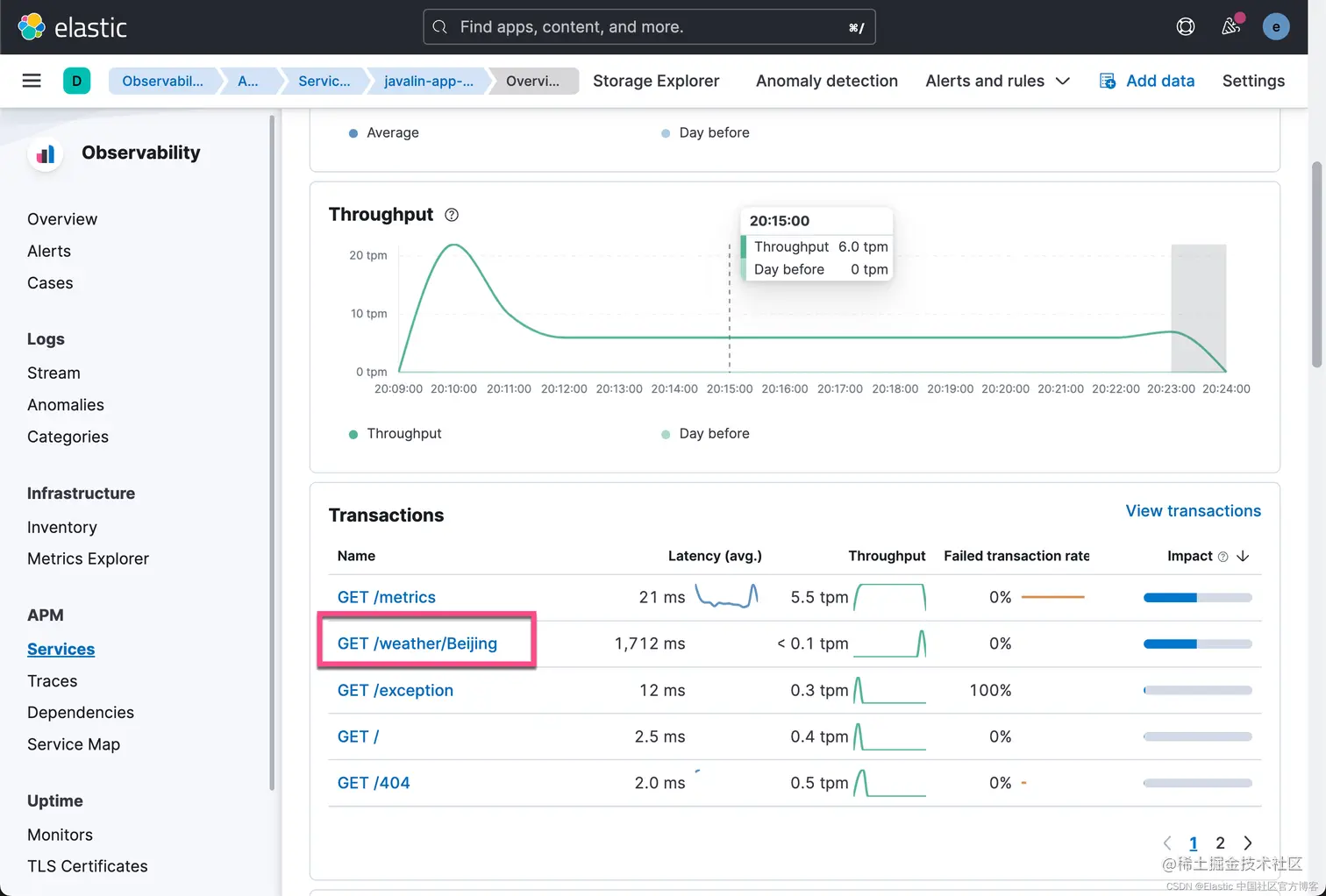 显然这次我们只看到一个 transaction:/weather/:city,而不以每个城市分别命令的 transaction。