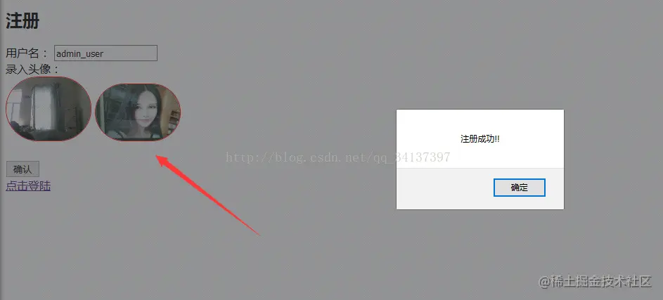 1.前台通过扫描人脸进行注册,注册必填字段:username,password,id,headphoto