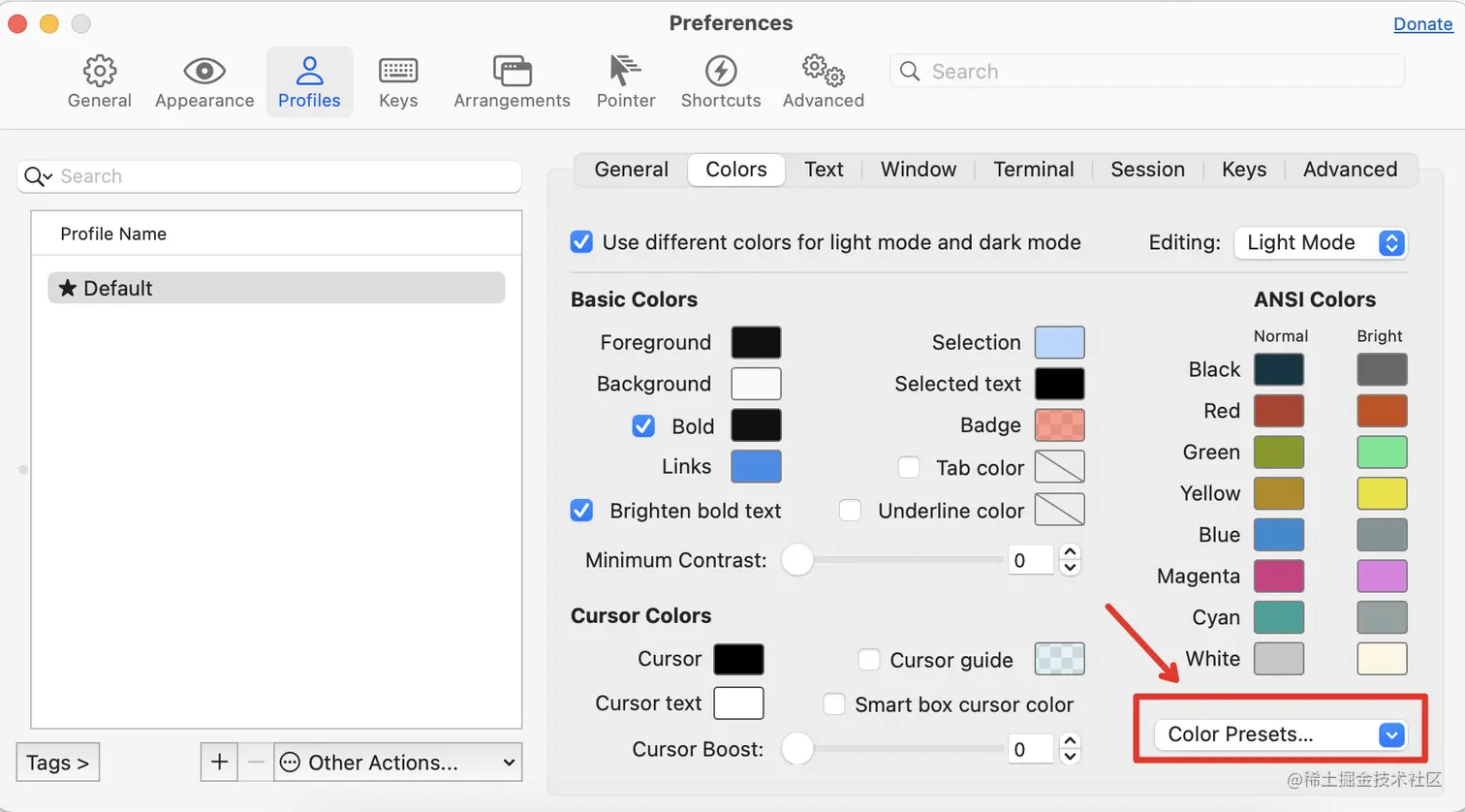 iTerm2,左上角打开Preferences,通过Profiles->Colors->Color Presets,选择Import选项,选择刚才解压的solarized->item2-colors-solarized->Solarized Dark.itemcolors文件,导入成功后在Color Presets下选择Solarized Dark主题