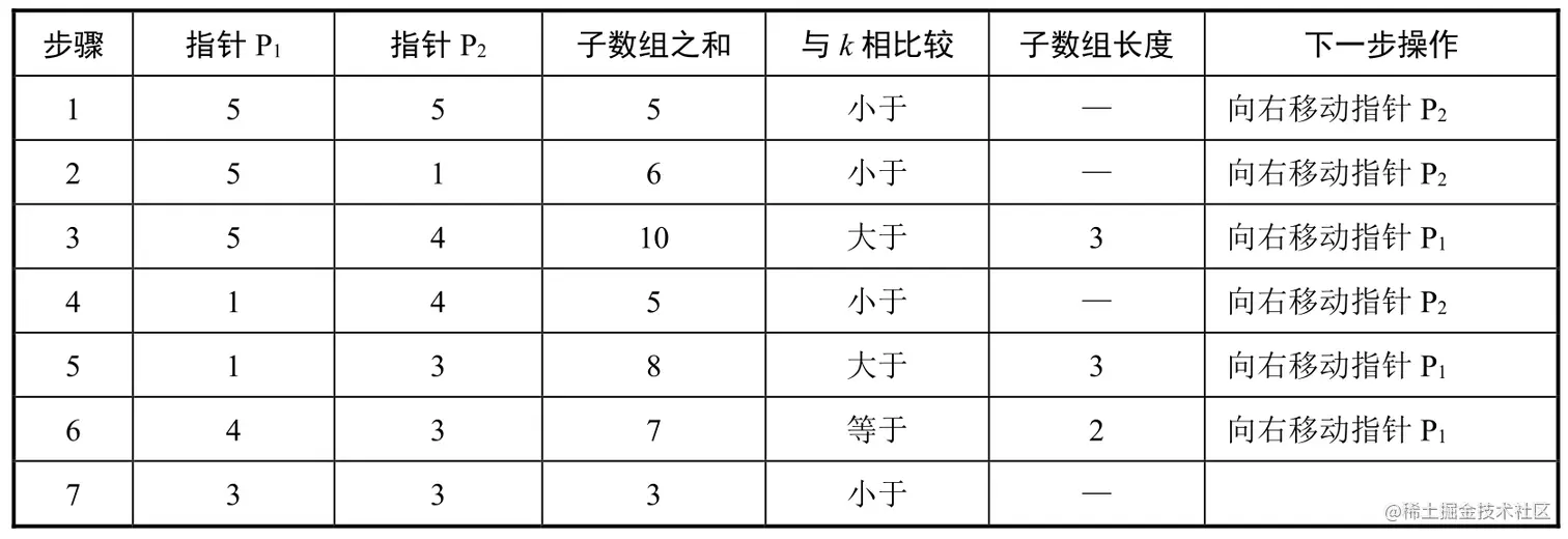 当指针P1和P2之间的子数组数字之和小于k时,向右移动指针P2,直到两个指针之间的子数组数字之和大于k,否则向右移动指针P1,直到两个指针之间的子数组数字之和小于k。