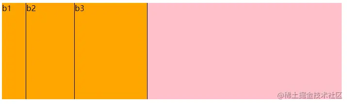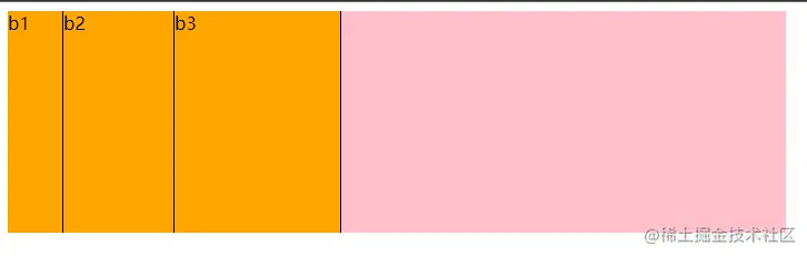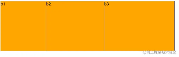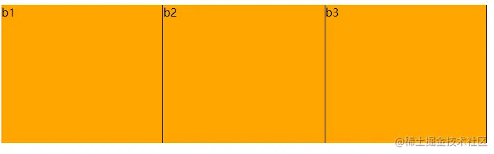 grow是增长,而flex-grow则是将元素(b1,b2,b3)在一定范围内进行增长,这个一定范围就是外面容器的大小,最终的目的就是横向填满这个容器。这个属性默认值为0,也就是说如果容器没填满,也不填了,该是多大就是多大。如果设置为一个正整数,则是将容器剩余空间除以所有flex值之和,然后按比例分配。上图种b1,b2,b3的flex-grow都为1,因此将剩余空间等比进行划分为3份,每个b各占一份。