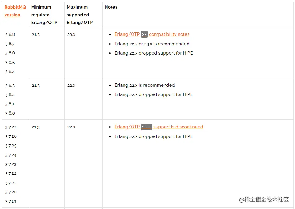 rabbitmq依赖于erlang,所以安装rabbitmq前需要先安装erlang rabbitmq和erlang在特定的对应版本下才能正常使用,所以安装时要注意使用的版本,下图供参考,更多详细信息可查看官方介绍