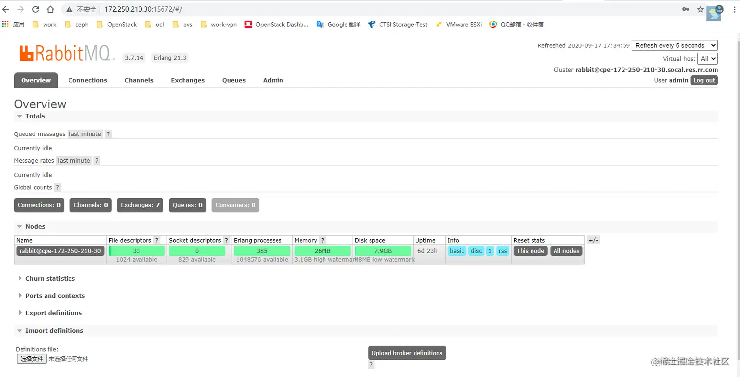 访问测试 http://ip:15672 登录成功后初始界面↓↓↓↓↓↓