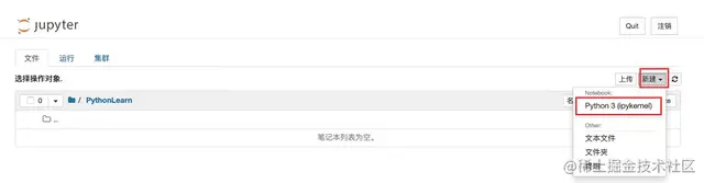 8、之后双击【PythonLearn】文件夹,进入到文件夹下,在右上角点击【新建】按钮,在下拉框中选择【Python3(ipykernel)】选项,如图所示。