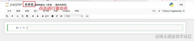 9、新建的Jupyter Notebook页面如图所示,点击标题栏的【未命名】处,进行重命名。