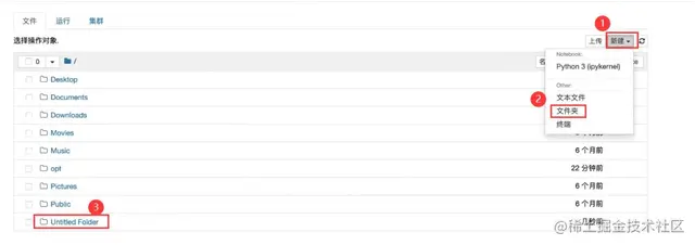 6、点击Jupyter Notebook右上角的【新建】按钮,之后点击【文件夹】按钮,即可创建一个未命名文件夹【Untitiled Folder】,如图所示。
