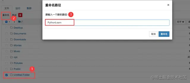 7、选中【Untitiled Folder】,可以进行改名称或者移动、删除操作,之后点击【重命名】按钮,在弹窗的窗口中自定义一个名字,这里命名成【PythonLearn】,如图所示。