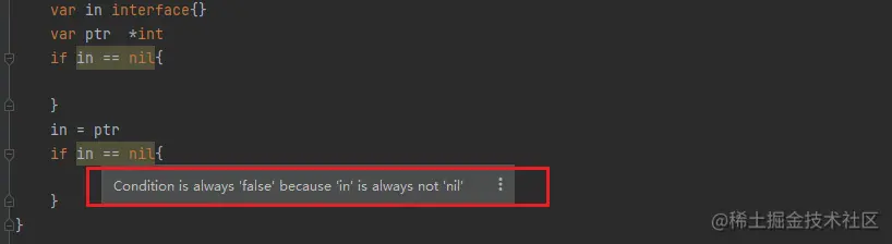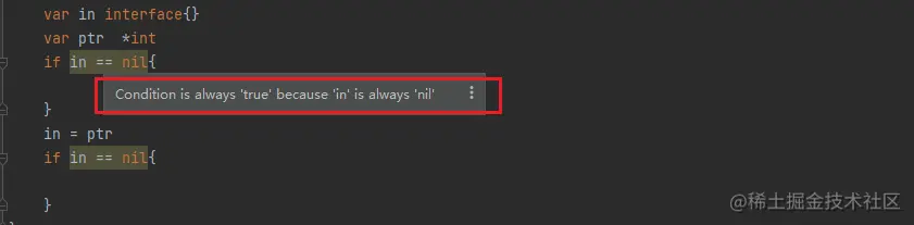 // 此时的 in ,类型是 *int ,值是 nil ,因此不会进来