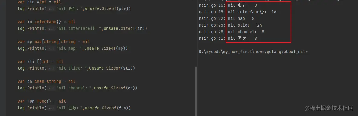那么对应到 Golang 中,以 nil 作为零值的数据结构,同样有自己所占用的空间,占用空间的大小也是不一样的,Golang 中可以使用 unsafe 包中的 Sizeof 方法来进行查看