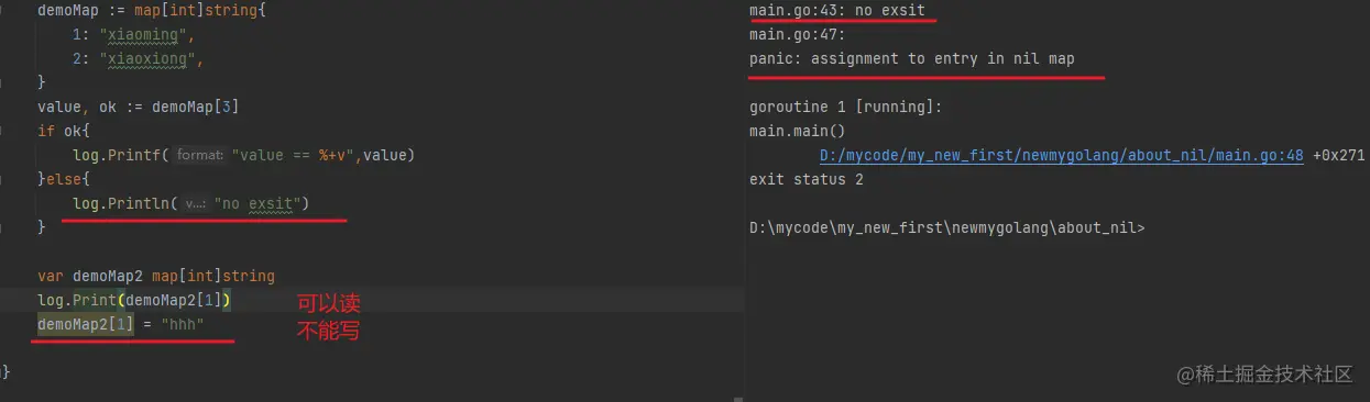 对于访问访问一个 nil 的 map ,不会出现问题,但是如果是去写入数据到某个节点上,那么就会出现 panic: assignment to entry in nil map