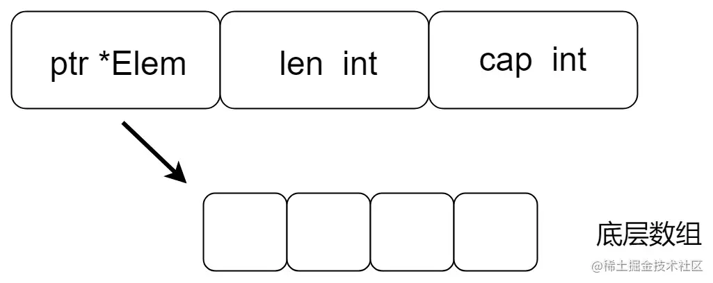 我们知道,切片的底层数据结构是,一个指针 ptr,一个 cap 表示切片容量,一个 len 表示切片中已有数据的长度