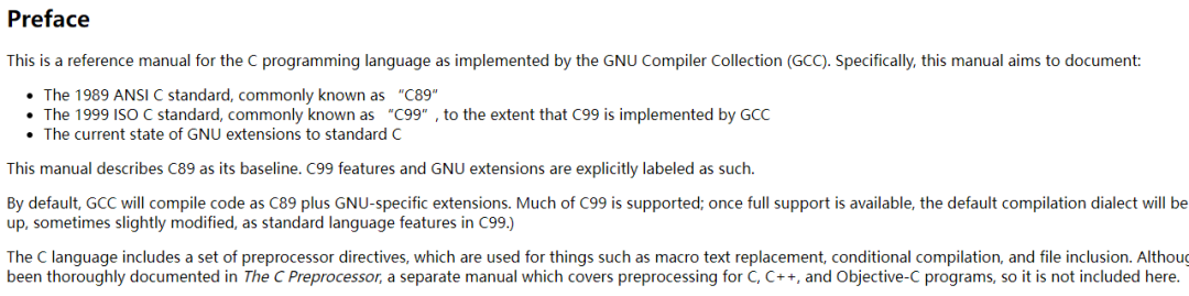 但只要你打开 GNU C 的手册,开头就把这个问题说的一清二楚。