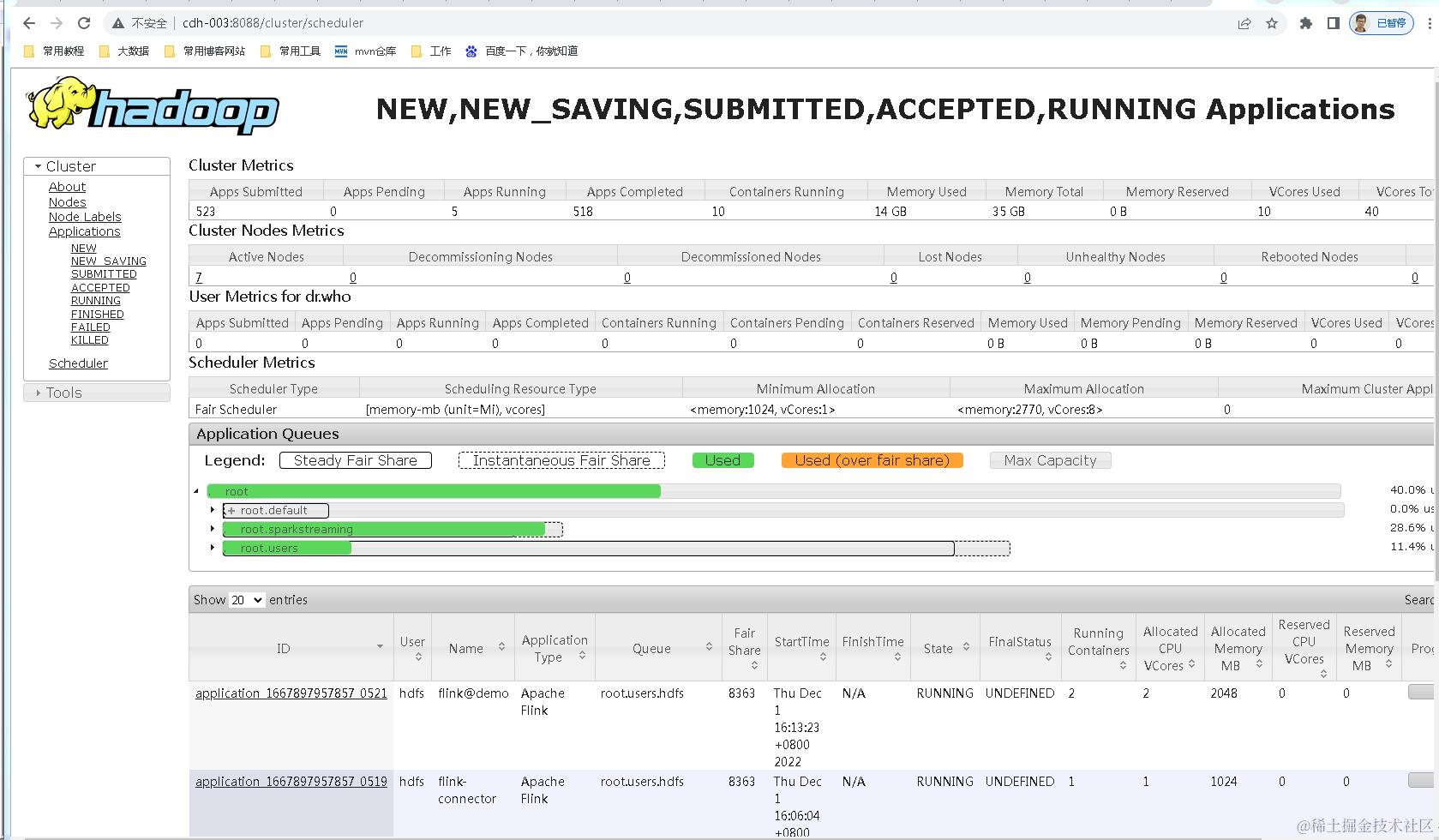这里假设你的hadoop集群是好的,yarn是可以正常使用的,8088端口可以访问,如下: