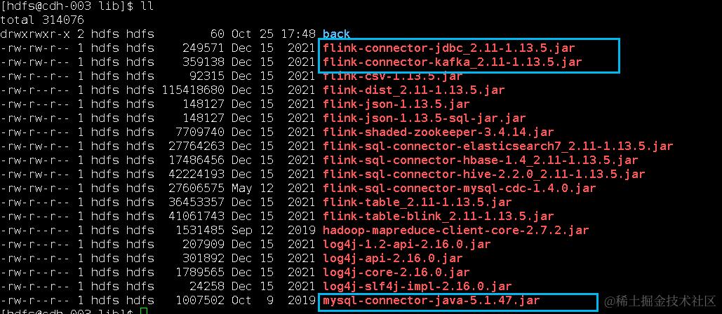 因为涉及到kafka和mysql,需要对应的connector依赖jar包,下图中标注出来了,放在Flink的lib目录(/var/lib/hadoop-hdfs/flink-1.13.5/lib)下面:
