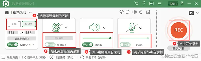 第2步: 进入“游戏录制”后,选择要录制的区域,根据需求选择开启“摄像头”,“扬声器”和“麦克风”,然后按下右边的 REC键,等待3秒后,就可以开始录屏了。