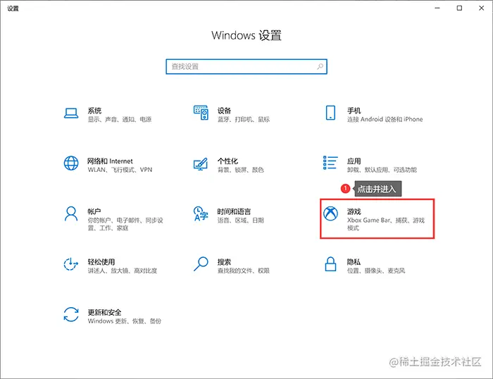 第1步: 按下“win+ i”按钮,在“设置”界面上单击“游戏”。