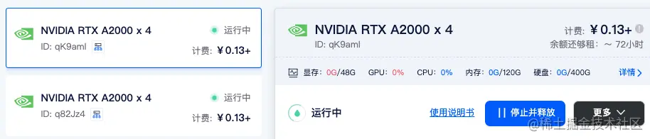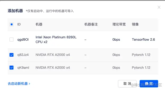 如两个计算节点,租用两台 A2000 4 卡,共计 8 卡。选择相同的Pytorch镜像,如Pytorch 1.12。