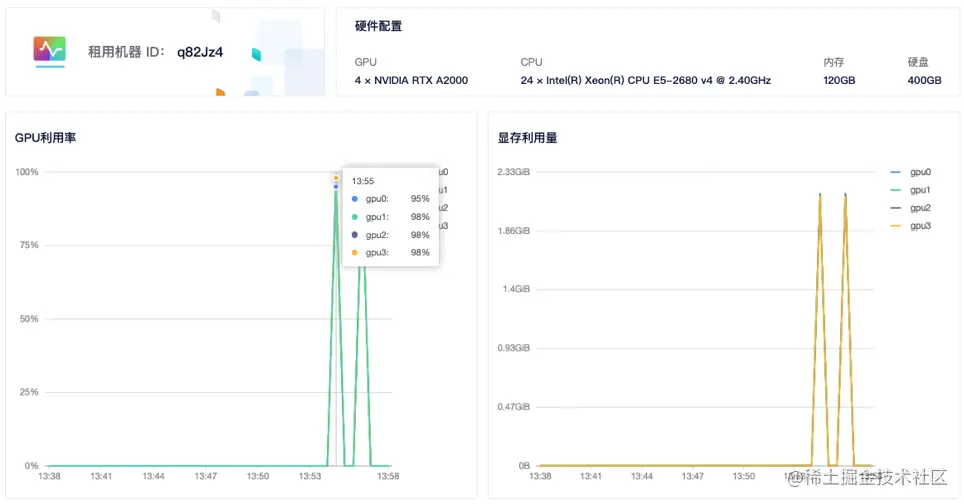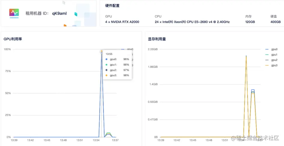 4)查看GPU使用情况: 租用界面点击详情按钮即可查看 GPU、CPU使用情况。从截图中可以看到 4 个显卡都有使用到。
