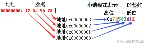 在小端模式表示法下,整数0x78563412在内存中的表示如下图所示:编辑