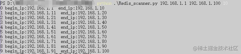 def scan(beg_ip,end_ip): """对指定ip返回内的主机进行检测""" #将点分十进制ip,转化成数值 beg_ip = ip_str2int(beg_ip) end_ip = ip_str2int(end_ip) #遍历数值ip返回 for ip in range(beg_ip,end_ip+1): ip = ip_int2str(ip) res,pwd = is_redis_server(ip,6379) if res ==1: print(ip) elif res==0 and pwd!=None: print ("%s -> %s"%(ip,pwd)) print("Scan Done!")