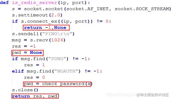 代码封装在is_redis_server函数中,传入参数为IP地址以及端口号,返回-1表明端口未开放或者开放但不是Redis服务,返回0表明是Redis服务但是需要访问密码;返回1表明是Redis服务且不需要访问密码。