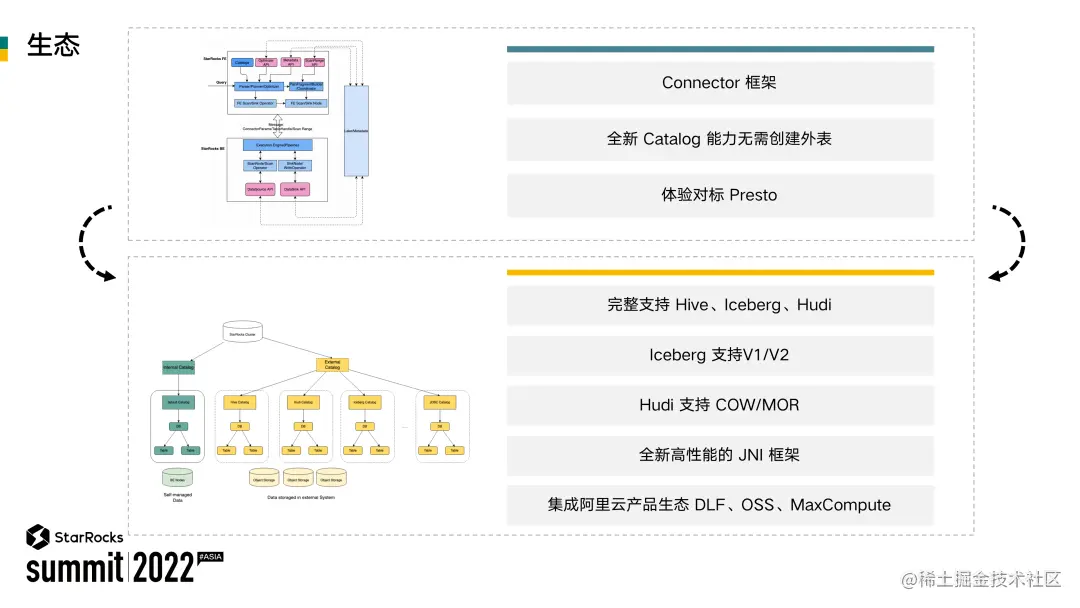 在 Connector 框架设计中我们引入了 Catalog 的概念,用户不在需要手动创建外表。比如说现在有 Hive Catalog、Iceberg Catalog,用户不需要去创建外表,只需要创建一个 Catalog,就能实时地获取到表的元数据信息。我们已经对 Hive、Iceberg、Hudi 做了完整的支持。同时在 EMR 产品生态里也已经集成好了前面提到的元数据管理的 DLF 以及 OSS、 Max Compute 等产品。