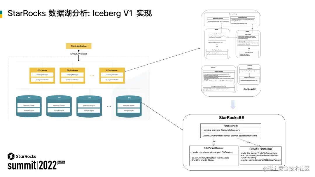 为了支持 Iceberg 的数据湖分析,我们在 FE 侧以及 BE 侧都做了大量的改造。首先是 FE 侧,增加了外表类型 IcebergTable;在执行计划生成之后,通过修改 RPC 协议(Thrift 协议),把执行计划相关信息发送给 BE;在 BE 侧,再通过通过 HDFS scanner 来支持实际的数据扫描。