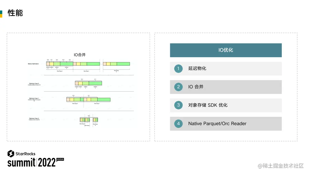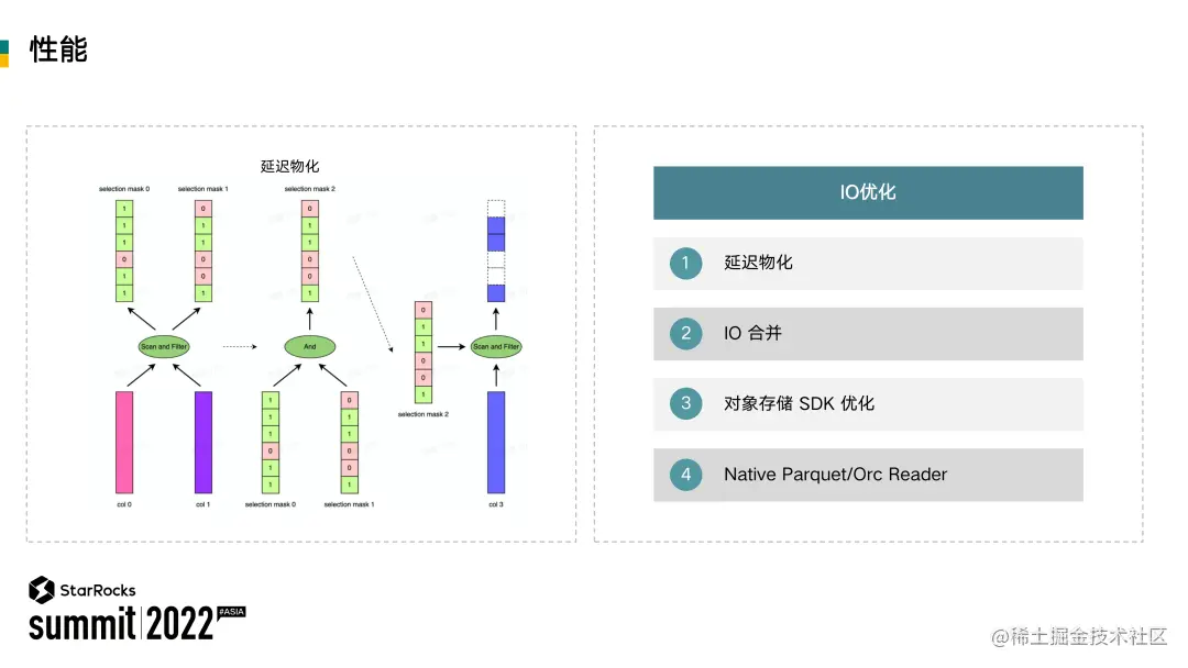 如何降低 IO 开销非常关键。在大部分情况下,数据湖中需要分析的数据和计算节点,基本上不会在同一台物理机器上。那么在分析过程中,我们就面临着非常大的网络 IO 挑战,为此 StarRocks 社区针对 IO 方面做了非常多的优化,包括延迟物化、IO 合并、支持 Native Parquet/Orc Reader、针对对象存储的 SDK 优化等工作。