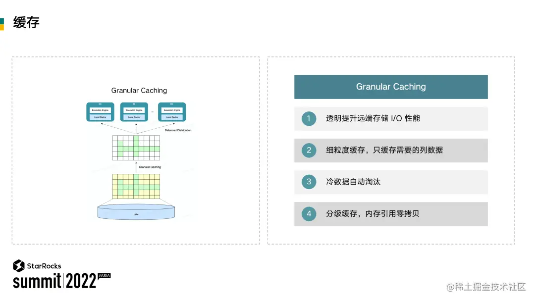 在实践过程中,另外一个问题就是元数据访问。在数据湖场景之下,对文件的 List 操作可能会成为整个网络访问的瓶颈。为了解决这个问题,在 StarRocks 的 FE 侧设计了一套完整的细粒度智能缓存方案,能够缓存 Hive 的分区信息,以及文件信息。