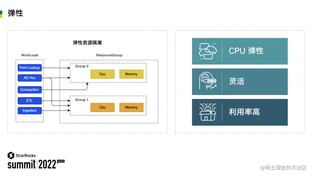 经过上面的改造,EMR StarRocks 能够支持弹性伸缩,从而支持最大程度地降本。有了弹性之后,我们还需要解决另一个问题,那就是资源隔离。数据湖上的查询 workload 通常多种多样,有直接对接 BI 出报表的,也有分析师查询明细的 Ad-Hoc 等等。通常用户都希望通过软性的隔离,而不是物理隔离,来实现小租户资源的弹性隔离。例如在集群资源空闲的时候,允许查询充分利用集群资源,但是当集群资源紧张时,各个租户按照自己的资源限制使用资源。因此 StarRocks 还实现了基于 ResourceGroup 的资源隔离,这样用户可以从用户、查询和 IP 等层面,限制其对 CPU/MEM/IO 等资源的使用。