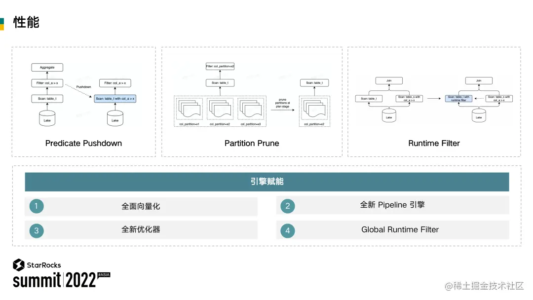 借助 StarRocks 已有的全面向量化执行引擎、全新的 CBO 优化器等,这些能力能够极大地提升我们在单表以及多表层面的性能表现。在这个基础之上,针对数据湖分析的场景,我们也增加了新的优化规则。