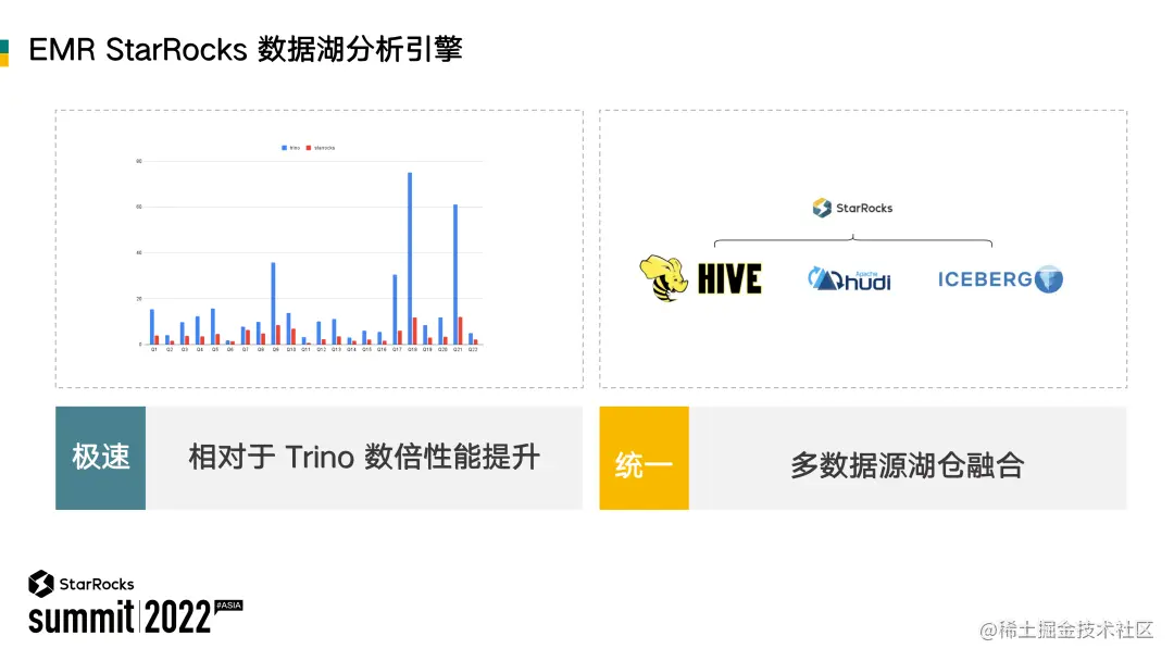 极速:相对于 Trino 有数倍的性能提升,上图这一页的测试数据是针对于 Hudi。
