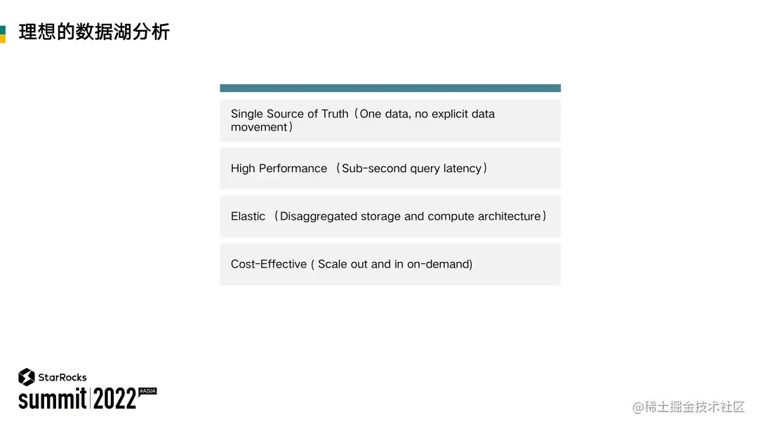 通过 Connector、数据 Catalogs,数据源的接入变得极其简单。通过缓存,数据湖存储系统的 IO 性能将不再成为瓶颈。通过物化视图,湖、仓数据的流转更加自然,湖、仓视图一致,查询可以透明加速,数据栈的架构变得更加简约。最后借助云上和 K8S 的弹性能力,StarRocks 数据湖分析能够做到真正的弹性、cost effective。