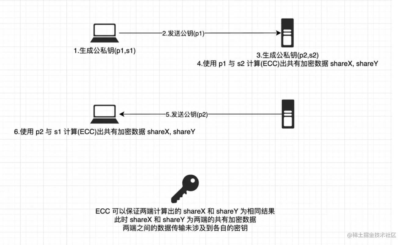ECDH 本身的协商流程如下图所示(按照数字编号走流程):