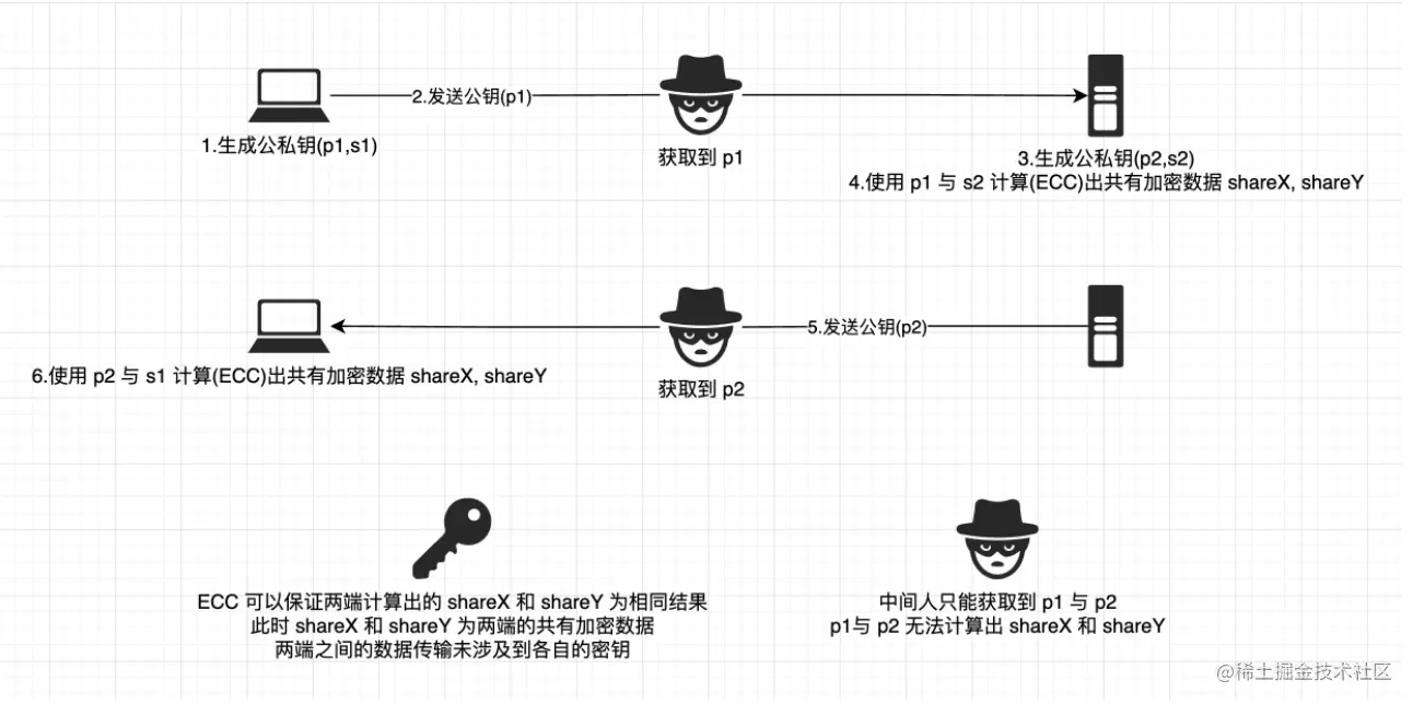 这样, 即使有中间人监听了两端之间的网络数据, 也只能获取到两端的公钥, 无法计算出真正的 shareX/shareY , 如图所示:
