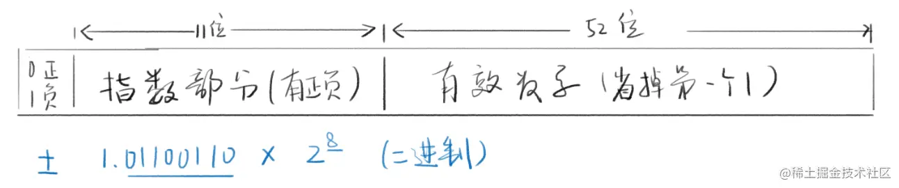 正负号占1位, 指数占11位(-1023~+1024), 有效数字占52位(开头的1省略)