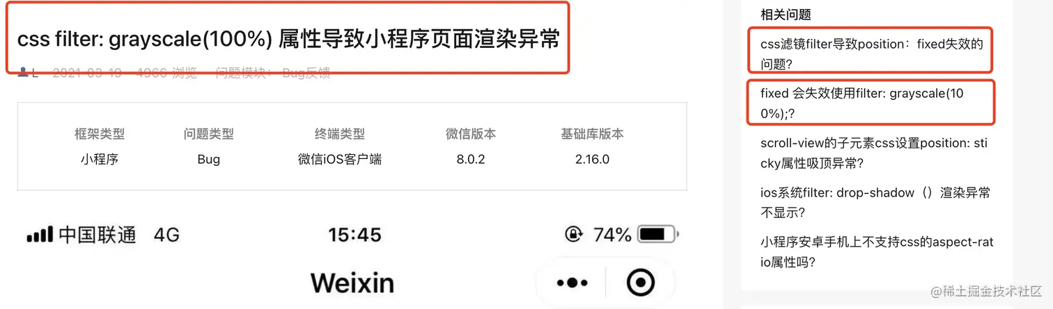 在处理小程序长列表的时候,添加filter: grayscale(1)的时候,不要给列表的每一个item添加,这种做法是极其耗费性能的,这个时候在IOS16表现下页面会卡死不动,所以我们在设置这个属性的时候一定要注意,给到父元素