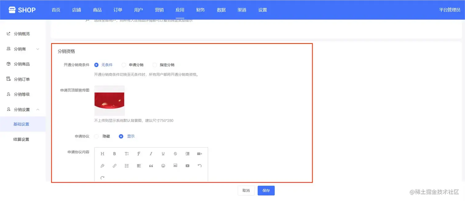 3.申请协议:显示在分销申请页面的,隐藏则表示不显示