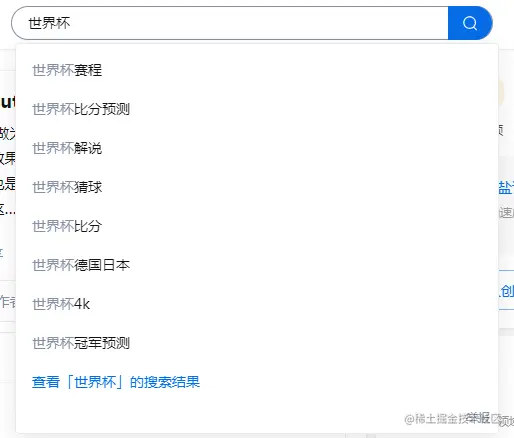 - 在你敲入第三个字的时候,触发了输入框的onchange事件,前端带着“世界杯”这三个字向后端发起1次请求