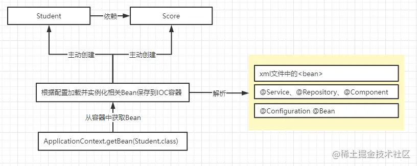 2、Spring里面很多方式去定义Bean,比如xml里面的标签、@Service、@Component、@Repository、@Configuration配置类中的@Bean注解等等。Spring在启动的时候,会去解析这些Bean然后保存在IOC容器里面。