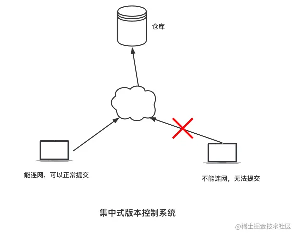 集中式版本控制系统的特点是需要远程服务器,如果无法连接远程服务器,我们所做的变更就无法提交,如下图所示: