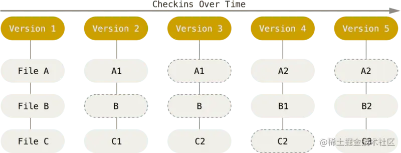 Git与其他版本控制系统的其他不同之处在于Git对待数据的方式,Git就像一个小型的文件系统,在我们每次提交,对整个文件系统做一个快照。