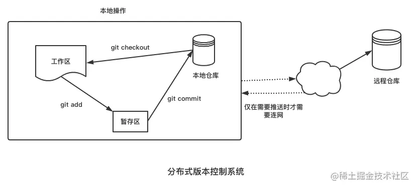 而在分布式版本控制系统中,每个端都保存着仓库完整的信息,不用联网也可以查询到所有的变更历史、在本地进行commit、checkout等操作,仅当你需要将变更推送到远程仓库,才需要网络,如下图所示: