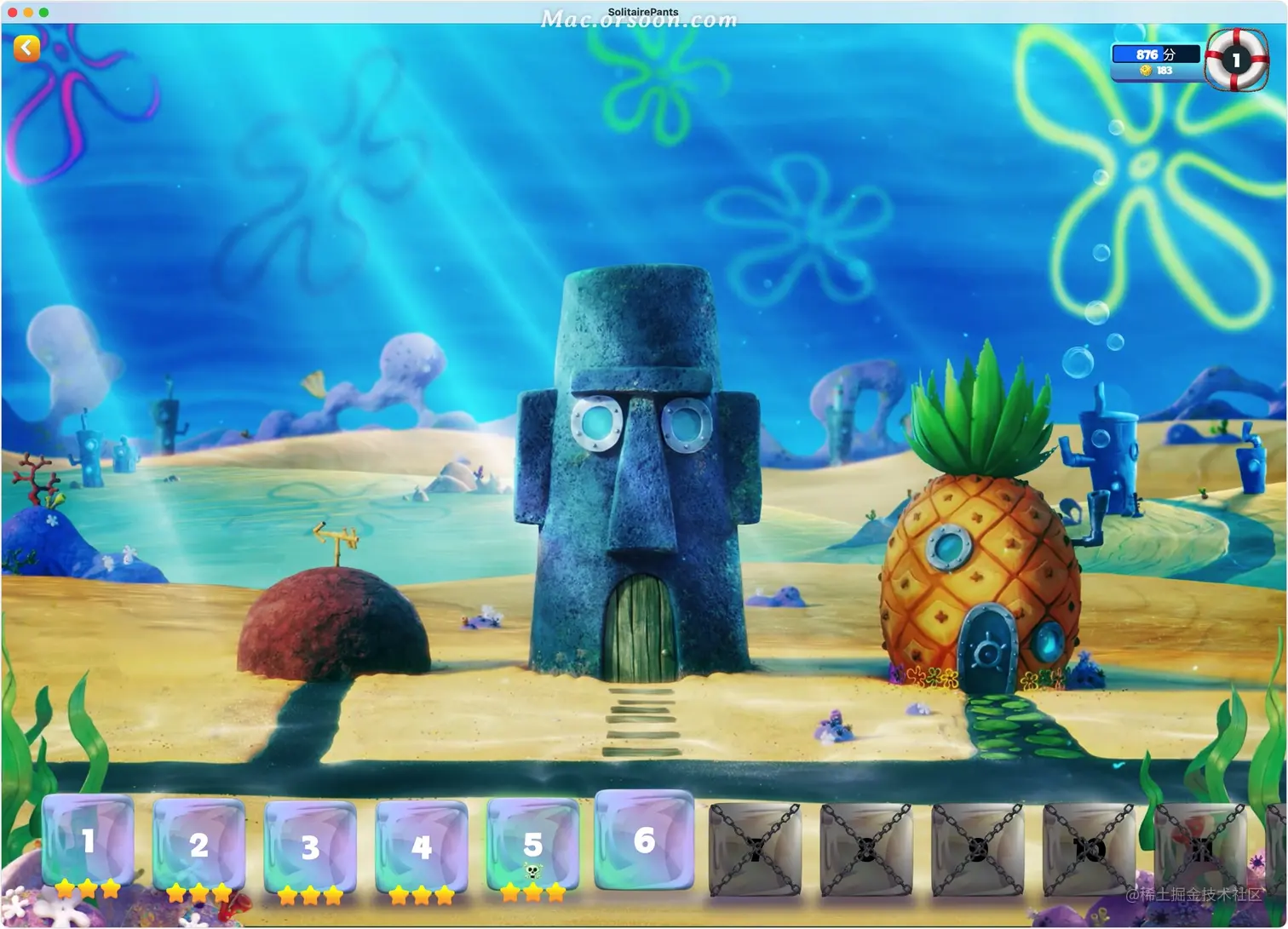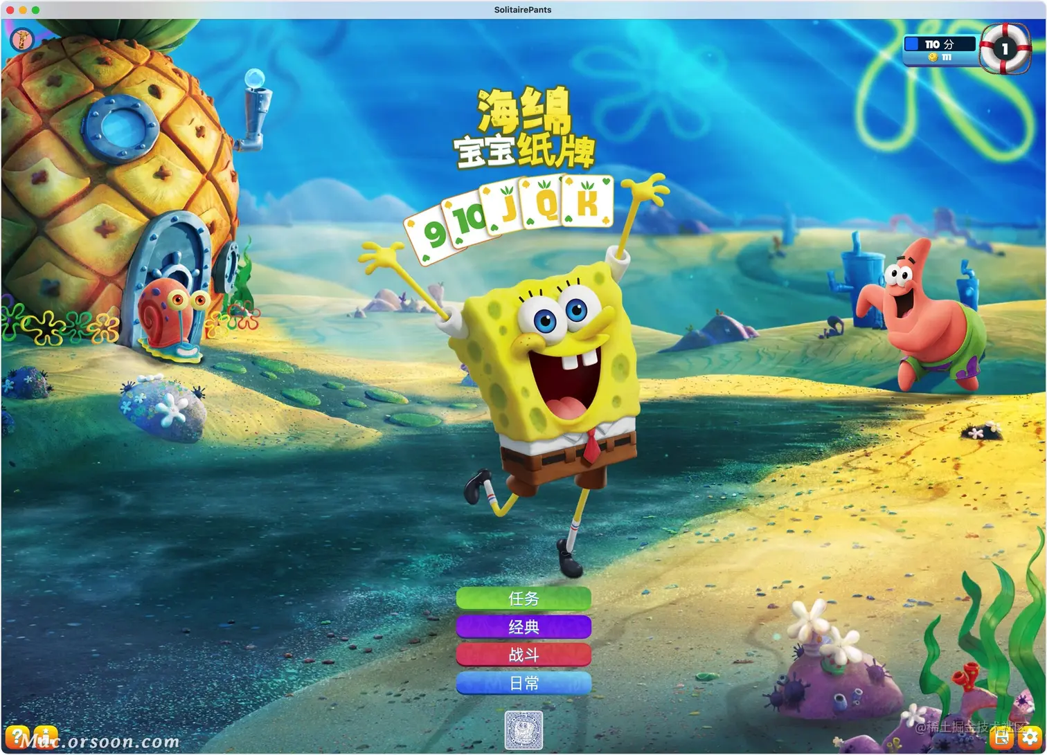 SpongeBob SolitairePants Mac是一款名为海绵宝宝的纸牌游戏,海绵宝宝纸牌 Mac破解版拥有精彩的任务、多人混战、经典的模式等游戏模式,海绵宝宝纸牌游戏经典模式有 52 张牌,游戏完全按照单人纸牌爱好者所期望的方式进行,直到所有 52 张牌都按顺序堆叠起来。