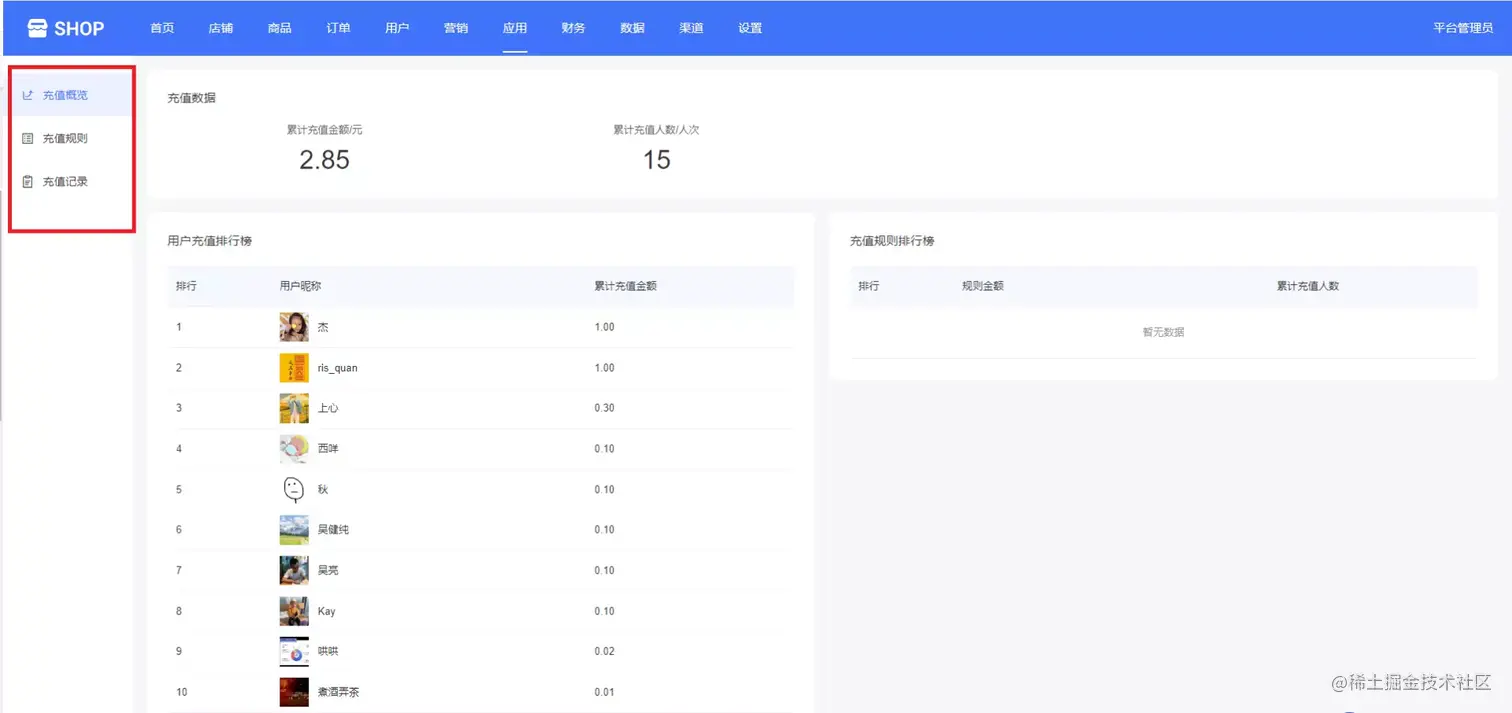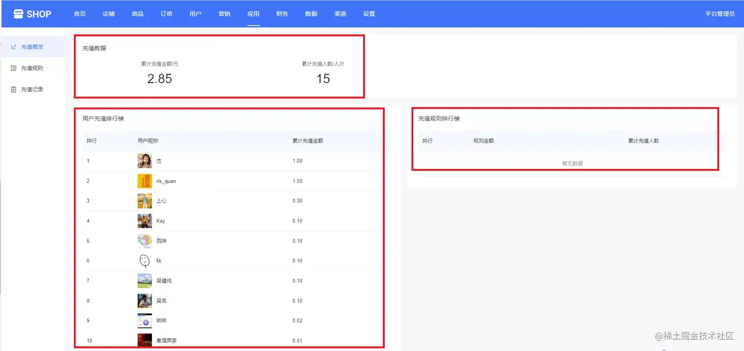 可以看到累计充值金额、累计充值的人数等充值数据,有用户充值排行榜,可以看到用户的排名、用户的昵称、用户累计的充值金额,如下图所示: