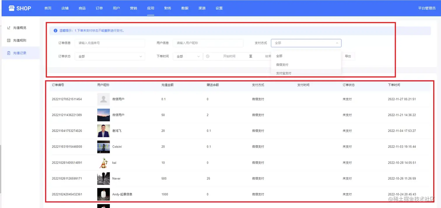 下面可以看到订单编号、用户昵称、充值金额、赠送余额、支付方式、支付时间、订单状态、下单时间等,如下图所示: