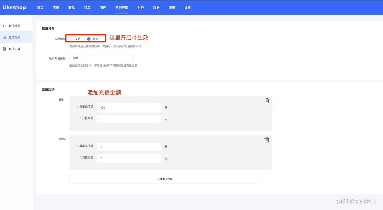 设置充值的应用状态(关闭或开启充值功能,关闭后商城将不显示充值入口),设置最低充值金额要求,不填或填0表示不限制最低充值金额。